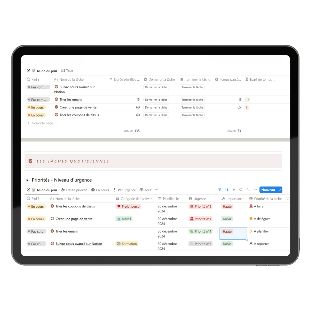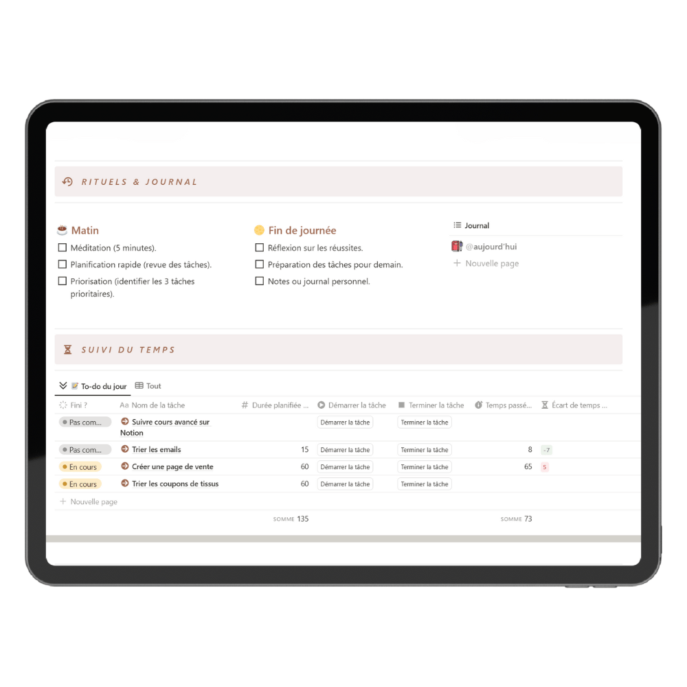 Découvrez un template Notion professionnel alliant priorisation intelligente, rituels quotidiens et suivi du temps.
